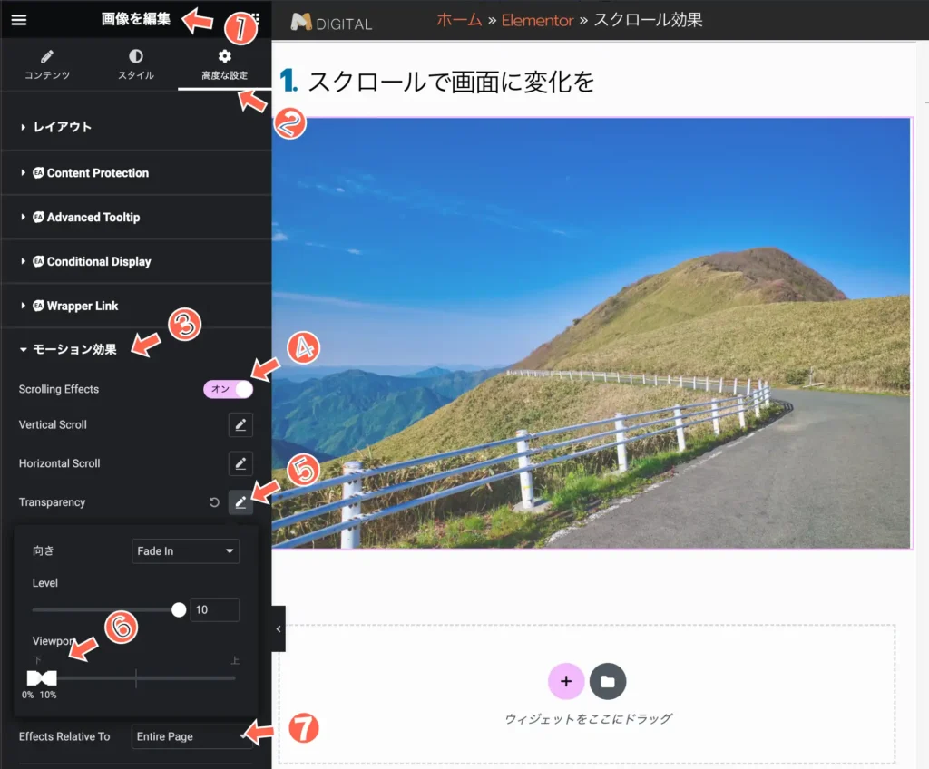 スクロールの効果のサンプルページです。印象に残るページの参考にしていただけると良いですね。Elementorより。