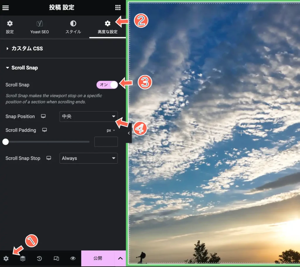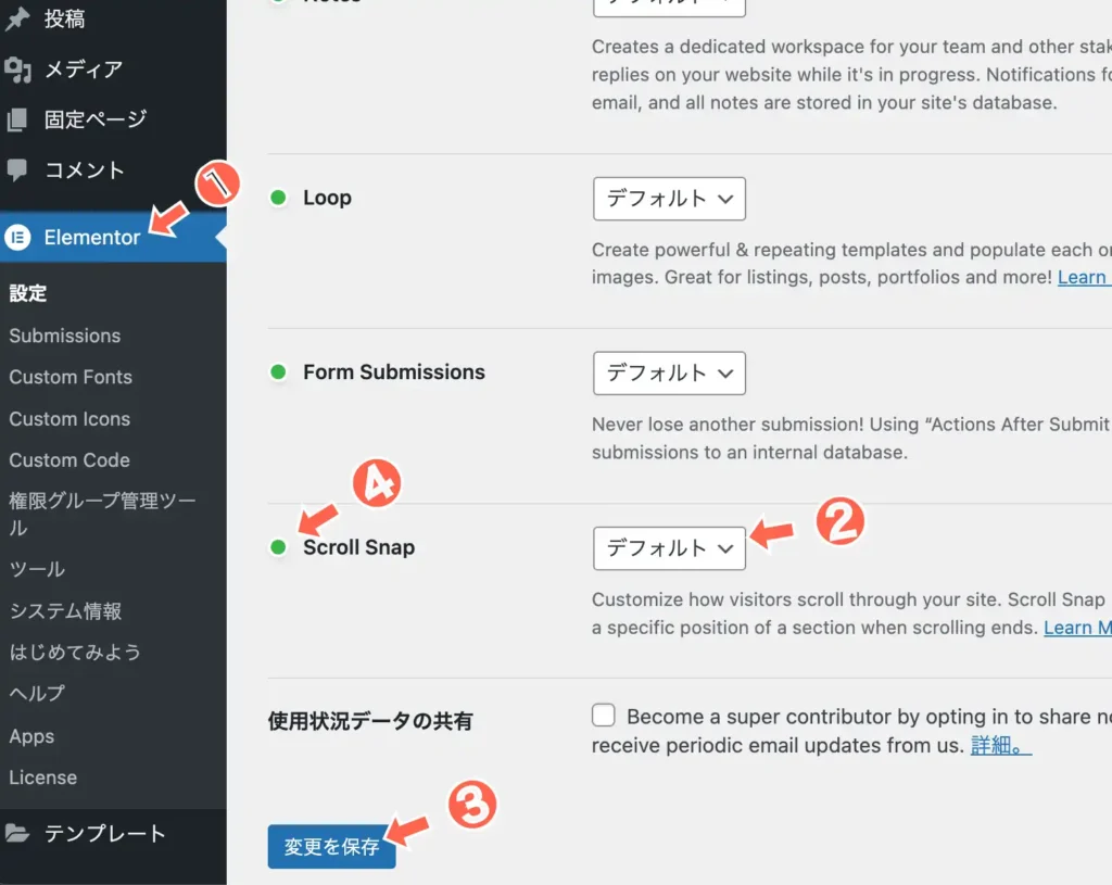ダッシュボードのElementorの設定の機能タブを選択し、Scroll Snap に緑の有効のチェックがされているか確認します。