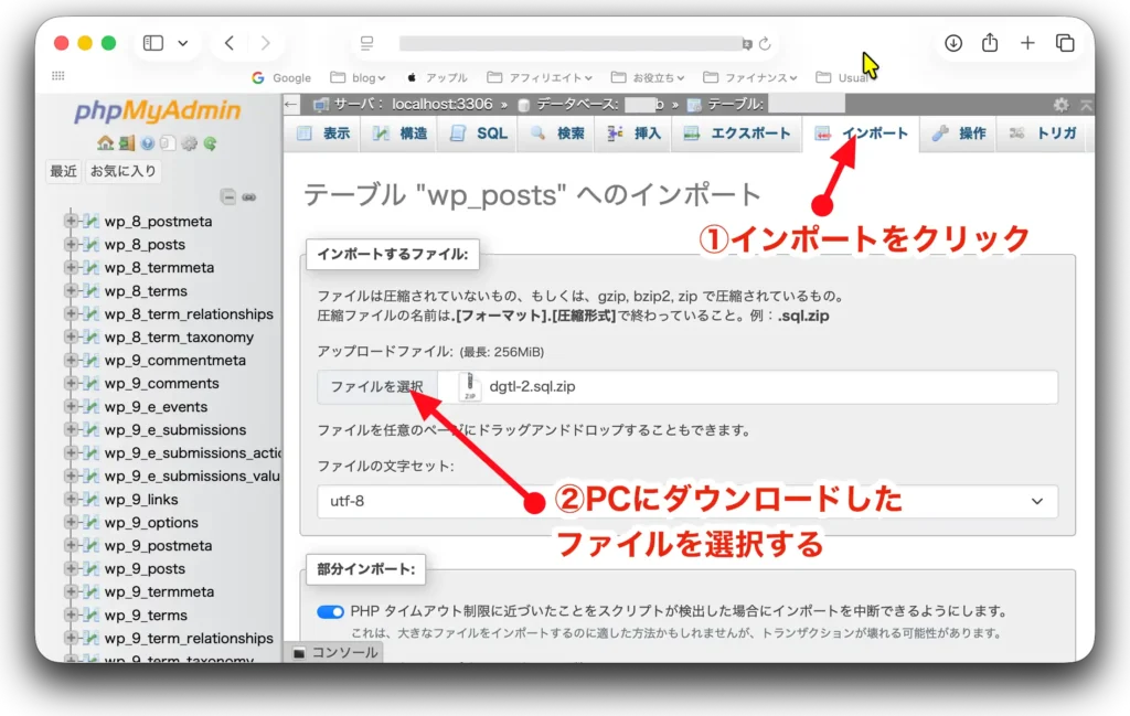 作業用のデータベースをクリックしてから「インポート」をクリックする。